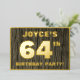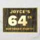 La parte delantera de esta audaz tarjeta de invitación a Relieve metalizado de sesenta y cuatro años de celebración/fiesta incluye un nombre editable, un gran número "64", el mensaje "¡FIESTA DE CUMPLEAÑOS!" y una frontera, todo en Relieve metalizado. El fondo del frente presenta un estilo rústico y sofisticado, inspirado en el grano de madera. En la parte posterior se incluyen detalles personalizados sobre el evento, como la fecha, la hora, la ubicación/lugar y cualquier otra información que pueda ser relevante. Las invitaciones personalizadas como estas pueden ser usadas para invitar a los invitados a una fiesta de cumpleaños que se lleva a cabo en celebración del cumpleaños 64 de alguien. [~Z0000598]