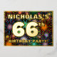 El frente de este alegre diseño de tarjetas de invitación para Relieves metalizados de celebración de sesenta y seis años tiene un nombre personalizado, un gran número "66", el mensaje "¡FIESTA DE CUMPLEAÑOS!" y una frontera. El fondo del frente tiene un patrón animado y colorido inspirado en fuegos artificiales de celebración reventando. En la parte posterior se incluyen detalles personalizados sobre el evento, como la fecha, la hora, la ubicación/lugar y cualquier otra información que pueda ser relevante. Las invitaciones personalizadas como estas pueden ser una manera divertida de invitar a los invitados a una reunión de cumpleaños que se lleva a cabo en celebración del 66 cumpleaños de alguien. [~Z0000602]
