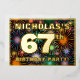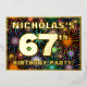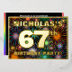 El frente de este vibrante diseño de tarjeta de invitación para Relieve metalizado de cumpleaños sesenta y siete años cuenta con un nombre personalizado, un gran número "67", el mensaje "¡FIESTA DE CUMPLEAÑOS!" y un borde. El fondo del frente tiene un patrón animado, multicolor, inspirado en fuegos artificiales de celebración. En la parte posterior se incluyen detalles personalizados sobre el evento, como la fecha, hora, lugar/ubicación y cualquier otra información útil. Las invitaciones a personalizables como estas pueden ser una manera divertida de invitar a los asistentes a una fiesta de cumpleaños que se lleva a cabo para celebrar el cumpleaños 67 de alguien. [~Z0000602]