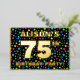 El frente de esta divertida y alegre tarjeta de invitación a Relieve metalizado de 75 años de celebración/fiesta presenta un nombre editable, un gran número "75", el mensaje "¡FIESTA DE CUMPLEAÑOS!" y un borde. El fondo del frente tiene un patrón de estrellas emocionante y multicolor. En la parte posterior se incluyen detalles personalizados sobre el evento, como la fecha, la hora, el lugar y cualquier otra información que pueda ser relevante. Invitaciones personalizadas como estas pueden ser una manera divertida de invitar a asistentes/invitados a una reunión de cumpleaños que se lleva a cabo para honrar el cumpleaños 75 de alguien. [~Z0000600]