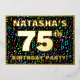 La parte delantera de este divertido diseño de tarjetas de invitación para Relieves metalizados de cumpleaños setenta y cinco incluye un nombre personalizado, un gran número "75", el mensaje "¡FIESTA DE CUMPLEAÑOS!" y un borde. El fondo del frente tiene un alegre patrón de símbolos musicales multicolores. En la parte posterior se incluyen detalles personalizados sobre el evento, como la fecha, la hora, el lugar/lugar y cualquier otra información que pueda ser útil. Invitaciones personalizadas como estas pueden ser una manera divertida de invitar a los invitados a una fiesta de cumpleaños que se lleva a cabo en celebración del cumpleaños 75 de alguien. Esto podría ser más significativo para una fiesta de cumpleaños con temática musical. [~Z0000601]