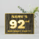 La parte delantera de esta audaz tarjeta de invitación a Relieve metalizado de noventa y dos años de celebración/fiesta incluye un nombre personalizado, un gran número "92", el mensaje "¡FIESTA DE CUMPLEAÑOS!" y una frontera, todo en Relieve metalizado. En el fondo de la fachada se respira un estilo rústico y sofisticado, inspirado en los granos de madera. En la parte posterior se incluyen detalles personalizados sobre el evento, como la fecha, hora, lugar y cualquier otra información que pueda ser importante. Las invitaciones personalizadas como estas pueden ser usadas para invitar a invitados/asistentes a una reunión de cumpleaños/fiesta que se celebra para celebrar el cumpleaños 92 de alguien. [~Z0000598]