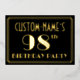 La parte delantera de esta invitación al Relieve metalizado de fiesta de 98 cumpleaños/celebración de estilo vintage tiene un nombre de personalizable, un gran estilo Art Déco inspirado en el número "98", el mensaje "PARTIDO DE CUMPLEAÑOS" y un patrón fronterizo compuesto de líneas. Hay un fondo de color negro en el frente de forma predeterminada, pero se puede personalizar a un color diferente si se desea. En la parte posterior se incluyen detalles personalizados sobre el evento, como la fecha, hora, lugar y cualquier otra información que pueda ser importante. Invitaciones lujosas, elegantes y editables como estas podrían ser usadas para invitar a los invitados a una fiesta de cumpleaños/reunión que se lleva a cabo en celebración del cumpleaños 98 de alguien. [~Z0000591]