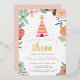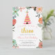 Las invitaciones para su tercer cumpleaños salvaje incluyen un borde floral boho y un ilustracion de té rosado. "Joven, salvaje y tres" aparece en letras de Relieve metalizado dorado, con los detalles de tu fiesta de tercer cumpleaños debajo, sobre un fondo blanco acentuado con guarnecido de Relieve metalizado dorado.