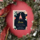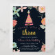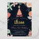 Las invitaciones para su tercer cumpleaños salvaje incluyen un borde floral boho y un ilustracion de té rosado. "Joven, salvaje y tres" aparece en letras de Relieve metalizado dorado, con los detalles de tu fiesta de tercer cumpleaños debajo, sobre un rico fondo azul marino acentuado con guarnecido de Relieve metalizado dorado.
