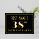 La parte delantera de esta invitación de cumpleaños número treinta y ocho de estilo inspirado en los años 20/30 y apariencia vintage de papel de aluminio presenta un nombre personalizado, un gran número “38º” de estilo art déco, el mensaje “FIESTA DE CUMPLEAÑOS” y un patrón de borde que consiste en líneas. La parte delantera también presenta un fondo de color negro por defecto, pero se puede personalizar a un color diferente si se desea. La parte trasera presenta detalles personalizados sobre el evento, como la fecha, la hora, el lugar y cualquier otra información que pueda ser importante. Invitaciones elegantes, lujosas y personalizadas como estas podrían utilizarse para invitar a los invitados a una reunión de cumpleaños que se celebra para honrar el cumpleaños número 38 de alguien.