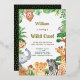 Una linda invitación de cumpleaños (o cualquier cumpleaños) con tema de safari de la jungla en lámina de oro que representa una escena de jungla tropical salvaje en acuarela, completa con una colección de adorables animales salvajes. Este tema presenta animales salvajes y aves como elefante, guepardo, jirafa, cebra, mono, tucán y avestruz enmarcando la tarjeta. El texto tipográfico 'Wild One' en lámina de oro real con efecto de sombra se puede personalizar con su propio texto. El color de fondo también se puede personalizar según sus necesidades.