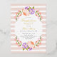 Tarjetas de invitación personalizadas para fiestas de graduación asequibles e impresas con los detalles de su evento. Este hermoso diseño botánico presenta un marco de acuarela de flores de durazno y lavanda sobre un fondo a rayas de color rosa. Utilice las herramientas de diseño para personalizar el texto, editar las fuentes y los colores o agregar sus propias fotos para crear una elegante invitación floral de graduación para la primavera.