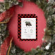 Ilustración de un bisonte llevando un árbol de Navidad sobre un fondo blanco con borde de cuadros de búfalo rojo y negro.