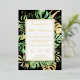 Esta elegante invitación de recepción de fuga tropical presenta hojas de palma, filodendro y helecho en verde y dorado sobre un fondo negro. Un elegante marco de lámina dorada resalta el texto en lámina dorada. Salpicaduras de lámina dorada acentúan este diseño botánico exótico y aportan un toque de fantasía moderna a la invitación. "Celebración de Felicidad Eterna" junto con los nombres de la novia y el novio aparecen en la parte superior. Los detalles de los votos matrimoniales y la ubicación y fecha de la recepción se detallan en la parte delantera. La información de RSVP está en el dorso de la invitación.