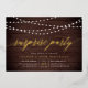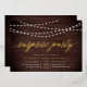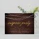 Nuestras invitaciones festivas para fiestas sorpresa cuentan con un fondo rústico de madera con cuerdas de luces blancas en la parte superior, y "fiesta sorpresa" en la tipografía de escritura de caligrafía de Relieve metalizado de oro de moda. Personalice con sus sorprendentes detalles de celebración bajo blanco; puede ser usado para cualquier ocasión, como fiestas de cumpleaños o fiestas de aniversario.