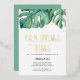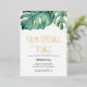 Las invitaciones personalizadas de caligrafía tropicales y elegantes enmarcan los detalles de su evento con un borde de confeti dorado simple y vegetación tropical sobre un fondo blanco crujiente. Los detalles de su evento están configurados en un tipo de letra simple sans serif y letra manuscrita en hoja de oro real. Perfecto para una escapada de chicas de fin de semana de soltera en la playa de Palm Springs. Para ver más invitaciones de boda lindas e invitaciones de fiesta de soltera y itinerarios a juego como este, visite Do Tell A Belle en Zazzle en www.zazzle.com/dotellabelle