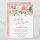 La elegante y moderna invitación a la ducha floral floral para bebés cuenta con un ramo de suaves rosas acuarelas pastel, peonías e hidrangeas en tonos rosa, melocotón y crema, con hojas botánicas verdes y eucaliptos. Personalice los detalles de su ducha de bebé con elegantes letras azules ahumadas acentuadas con caligrafía de estilo manuscrito en la impresión real de Relieve metalizado de oro rosa.