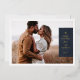 This rustic Christmas card features a large photo with a white border frame. On the right side of the card, there is a blue, vintage-inspired label with the holiday greeting and space for the customer's name. There is a small pine tree illustration on top of the label, as well as a subtle woodgrain texture in the background. The details on the front of the card are stamped in gold or silver foil. The back of the card features a coordinating, all over pine tree pattern.