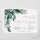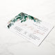 Elegante género neutro a través de la invitación mitzvah cuenta con hojas de eucaliptos acuarelas y hojas de follaje verde en cascada desde la esquina superior izquierda, adornadas con acentos de Relieve metalizado de oro rosa. Personaliza con tu ceremonia en el templo y los detalles de la celebración alineados a la derecha. Las tarjetas cambian a verde forestal sólido.