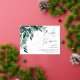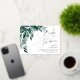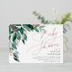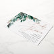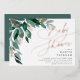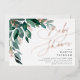 La elegante invitación a la ducha neutra de género incluye hojas de eucalipto de color agua y hojas de follaje verde en cascada desde la esquina superior izquierda, adornadas con acentos de Relieve metalizado de oro rosa. Personalice los detalles de la ducha de bebé alineados a la derecha. Las tarjetas cambian a verde forestal sólido.
