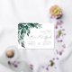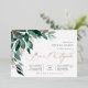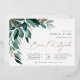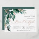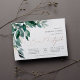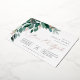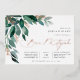 La elegante invitación a la barra neutra de género mitzvah presenta hojas de eucalipto de color agua y hojas de follaje verde en cascada desde la esquina superior izquierda, adornadas con acentos de Relieve metalizado de oro rosa. Personaliza con tu ceremonia en el templo y los detalles de la celebración alineados a la derecha. Las tarjetas cambian a verde forestal sólido.