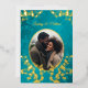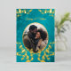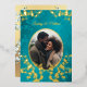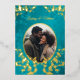 Esta elegante invitación a la boda incluye una foto redonda rodeada de ramas de flores de cerezo de Relieve metalizado dorado sobre un brillante fondo turquesa floral. Nombres de novias y novios en un elegante guión clásico.