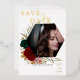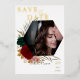 El diseño presenta elegante burgundy, vegetación esmeralda, hojas de eucalipto doradas, una foto de pareja y un texto de "guarda la fecha". Personaliza con los detalles de tu boda y encuentra diseños coincidentes en mi tienda "DreamHut".