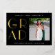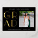 Una tarjeta minimalista moderna para anunciar una graduación. El frontal presenta GRAD en una tipografía de Relieve metalizado de oro de moda. Personaliza con una foto del graduado, el nombre de las graduaciones, el año de graduación y la escuela. El reverso tiene una plantilla de tipografía para personalizar con su propio mensaje o puede borrar todo el texto para dejar en blanco.