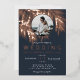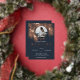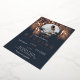 Moderna y sencilla acuarela de palmera de rosa dorado con una tipografía simple, un tema de moda y boda tropical sobre la hoja de palmera. Añade la foto de tu pareja en un fondo azul marino minimalista y editable.