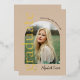 Esta moderna y elegante invitación a graduarse es ideal para cualquier graduado. Muestra tipografía de oro en Relieve metalizado de oro brillante e incluye una foto del graduado en la parte delantera, con un moderno y moderno marco de arco.