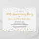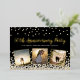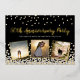 Diseño elegante de invitación personalizada para fiesta de aniversario que incluye confeti dorado y plateado sobre fondo negro, tipografía de letra cursiva moderna con las palabras "Fiesta de aniversario 50", su nombre y fecha de aniversario y tres de sus fotos favoritas enmarcadas en lámina metálica dorada. Personalícelo con los detalles de su fiesta en el reverso de la invitación.