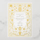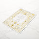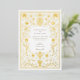 Anuncie su día especial con una elegancia inigualable utilizando esta exquisita invitación a la boda, con un impresionante diseño de Relieve metalizado dorado. Inspirado en la elegante época Art Nouveau, el intrincado borde muestra unas naves doradas, delicadas flores de oro de cinco pétalos estilizadas y elegantes tendrils de hojas, todo ello decorado con lujosos Relieves metalizados dorados que crean un impresionante efecto de relieve contra el inmaculado fondo texturado blanco o blanquecino. El marco floral ornamentado con arcos elegantes alrededor del panel central, donde los detalles de su boda se presentan en tipografía clásica. Este diseño atemporal es perfecto para parejas que buscan una invitación romántica, lujosa y artísticamente detallada.
