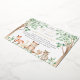 Invitación de Baby Shower con una acuarela pintada con animales de bosque en un bosque. El título del evento, "baby ducha", está en una tipografía de escritura caprichosa junto con tu nombre impreso en Relieve metalizado oro real. Esta invitación rústica a la ducha de bebé es neutra desde el punto de vista del género, así que es genial si estás teniendo un niño o un chica.