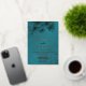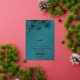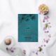 This elegant wedding invitation features gold line art floral cherry blossoms on a shimmering teal / turquoise background.