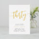 Celebra su cumpleaños con estas invitaciones de cumpleaños número 30 de la moda, que incluyen "treinta" en letras de guiones dibujadas a mano en Relieve metalizado oro moderno. Personalice con los detalles de su fiesta debajo. Una elección de lujo inolvidable para fabulosas celebraciones por los 30 años.