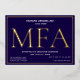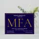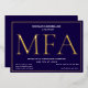 Invitación a una fiesta de graduación del MFA con Relieve metalizado dorado, texto blanco y fondo azul. Simplemente agrega tu información, agrega esta invitación a tu carrito y celebra este gran logro. Diseño de vacaciones de la invitación al Relieve metalizado de graduación de Blue Gold MFA | ©Melissa Patton - Diseñador