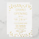 Gran invitación blanca con un toque de confeti en Relieve metalizado dorado y texto en Relieve metalizado dorado también. Elegante invitación de apertura blanca y dorada para su negocio.