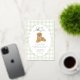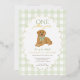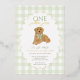 Celebra el primer cumpleaños de tu pequeña con esta encantadora invitación de "Un año dorado" que incluye a un adorable cachorro recuperador de oro con un arco de gingham verde. El fondo muestra un borde de gingham a cuadros de color verde claro con un marco de vieiras frustrado, perfecto para una fiesta de cumpleaños. Personalizable completo con el nombre de su hijo, detalles del fiesta e información de RSVP.