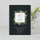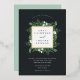Nuestra invitación a la boda de Greenhouse enmarca tus nombres con un elegante borde cuadrado de frondosos follajes verdes, hojas botánicas y pequeñas flores blancas con guarnecido de Relieve metalizado dorado. Personalice los detalles de su boda en letras clásicas con un acento de guión de caligrafía de moda. Un rico fondo negro oscuro te ofrece un marco sorprendente para tus detalles de la ceremonia. Una hermosa elección para bodas de verano por la noche, nupcias de otoño o otoño, o bodas de invierno nevadas.