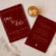 Anuncie su fecha boda con esta elegante tarjeta de Relieve metalizado de oro y borgoña. Personalizar de texto en la parte delantera y trasera con todos los detalles de su boda.