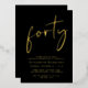 Eleva tu fiesta de 40 años con esta invitación negra de moda que incluye "cuarenta" en un guión elegante, tu nombre en una elegante tipografía serif y los detalles fiestas en letras simples y modernas, todo representado en tu elección de oro genuino, Relieve metalizado plateado o Relieve metalizado de oro rosa.