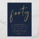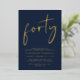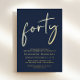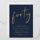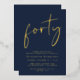 Eleva tu fiesta de 40 años con esta moda azul oscuro que incluye "cuarenta" exhibidos en un guión elegante, tu nombre en una elegante tipografía serif y los detalles fiestas con letras simples y modernas, todo representado en tu elección de oro genuino, Relieve metalizado plateado o Relieve metalizado de oro rosa.