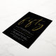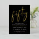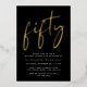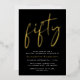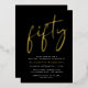 Invitación a la fiesta de 50 años de color negro moda con "cincuenta" en un guión elegante y tu nombre en una elegante tipografía serif, todo representado en tu elección de genuino Relieve metalizado de oro, plata o oro rosa, y los detalles fiestas con letras blancas sencillas y modernas.