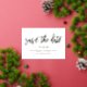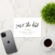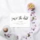 Este moderno pero elegante, salvo el anuncio de la fecha, presenta un fondo blanco clásico, el saludo "guardar la fecha" y la fecha de su boda en Relieve metalizado dorado, con su información debajo de negro. Puede personalizar este diseño aún más agregando otra foto o texto adicional al fondo. Relieve metalizado disponible en oro, plata o oro rosa y absolutamente brillos.