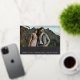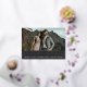 Una tarjeta de fecha moderna para guardar la tarjeta diseñada para acomodar tu foto de compromiso horizontal o horizontal favorita orientada a todo el paisaje. "Guardar la fecha" aparece debajo de la foto en bloques de Relieve metalizado dorado y letras de guión, junto con sus nombres, fecha de boda y ubicación del boda. Personalice la parte posterior con detalles adicionales, como el sitio web de su boda.