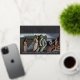 Una tarjeta de fecha moderna para guardar la tarjeta diseñada para alojar tres fotos de compromiso verticales alineadas una al lado de la otra. "Guardar la fecha" aparece debajo de sus fotos en bloques de Relieve metalizado de oro rosa y letras de guión, junto con sus nombres, fecha de boda y ubicación de boda. Personalice la parte posterior con detalles adicionales, como su sitio web boda.