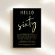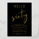 Invitación a la fiesta de cumpleaños número 60 de color negro moda con "hola sesenta" en una mezcla de un tipo de letra simple y un guión elegante, su nombre en una elegante tipografía serif y los detalles fiestas en letras modernas, todo representado en su elección de oro genuino, Relieve metalizado plateado o Relieve metalizado de oro rosa.