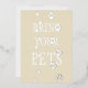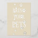 Huellas de patas de gato y perro doradas caminan sobre las palabras "Traiga a sus mascotas" que se pueden reemplazar con su mensaje personalizado. Personalice la parte trasera de su tarjeta para invitar a amigos con y sin pelo a su ocasión especial.