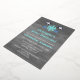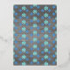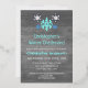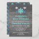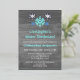 Invitación para el primer cumpleaños de un niño con copo de nieve en invierno en tierra firme. Cuenta con copas de nieve azules contra un fondo rústico de madera de pino.