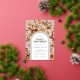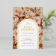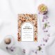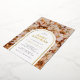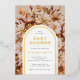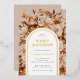 Este elegante y rústico Relieve metalizado dorado de otoño invita a bañarse en una ducha de bebé, con naranja quemado a color de agua pintada a mano y hojas de terracota, dahlias crema y beige y hermosos rosas de color rojizo. La parte trasera de la invitación tiene un fondo sencillo y un ramo de coordinación.