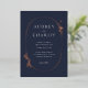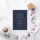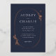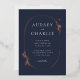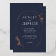 Un elegante diseño de invitación a la boda presenta tipografía blanca sobre un fondo de color marino, rodeada por una delicada corona floral de forma ovalada. La corona está elaborada a partir de una variedad de flores mullidas de Relieve metalizado dorado rosa, creando un ambiente suave y romántico. La tipografía es elegante y sofisticada, con una fuente serif clásica que añade el encanto general de la invitación.