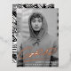 Moderna invitación de graduación que presenta la foto vertical del graduado con "Grad" en letras escritas a mano con Relieve metalizado de oro rosa real con un guion abajo. Personalice la invitación de graduación de fotos de moda agregando el nombre del graduado y el nombre de la escuela. La invitación de graduación del Relieve metalizado de oro rosa se invierte para mostrar un patrón de pinceladas de negro y blanco.