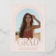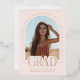 Presentamos nuestra invitación de graduación de fotos en forma de arco rosa, un conservador elegante y moderno diseñado con elegancia minimalista. El frente presenta una foto en forma de arco con un borde delgado y la palabra "grad" parcialmente sobre la foto -ambos impresos en un auténtico Relieve metalizado de oro rosa para ese toque de lujo. El resto del texto está en terracota / naranja quemado. Personalice la plantilla agregando su año de graduación, nombre y escuela para crear su invitación con facilidad. En la parte de atrás, sube una foto de tamaño completo e incluye una línea de firma. © Kimbellished, LLC