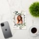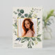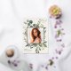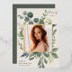 Nuestra invitación de graduación Eucalyptus & Sage enmarca una foto de tu graduado con un elegante borde cuadrado de eucalipto de acuarela exuberante y hojas verdes de salvia, con un verdadero guarnecido de Relieve metalizado dorado en un suave fondo de marfil blanco. Personalice el curso, el nombre y la escuela de su graduado. Añade un mensaje personal a la parte posterior, junto con una foto adicional.